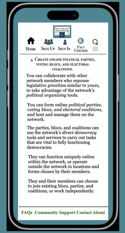 To summarize in closing, the network empowers voters to re-invent democracy by applying and adapting Swiss-inspired direct democracy tools to build consensus across partisan lines, within their home countries and cross-nationally. They can access the network free of charge and build large scale online voting blocs, political parties, and electoral coalitions with sufficient voting strength to defeat and replace unresponsive lawmakers.